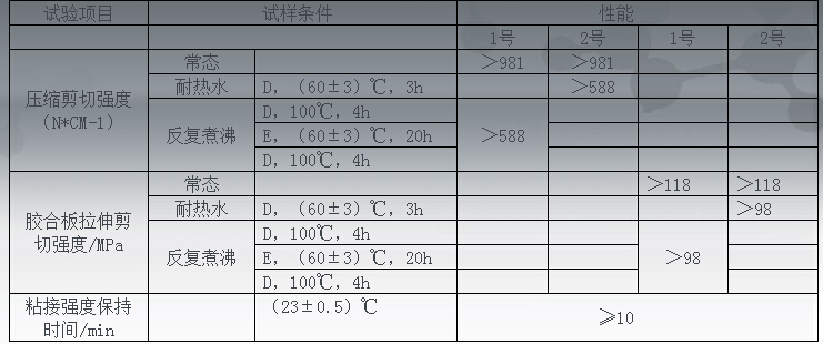表4:JIS K6806-2003 中對(duì)水性高分子異氰酸酯木材膠粘劑性能的要求